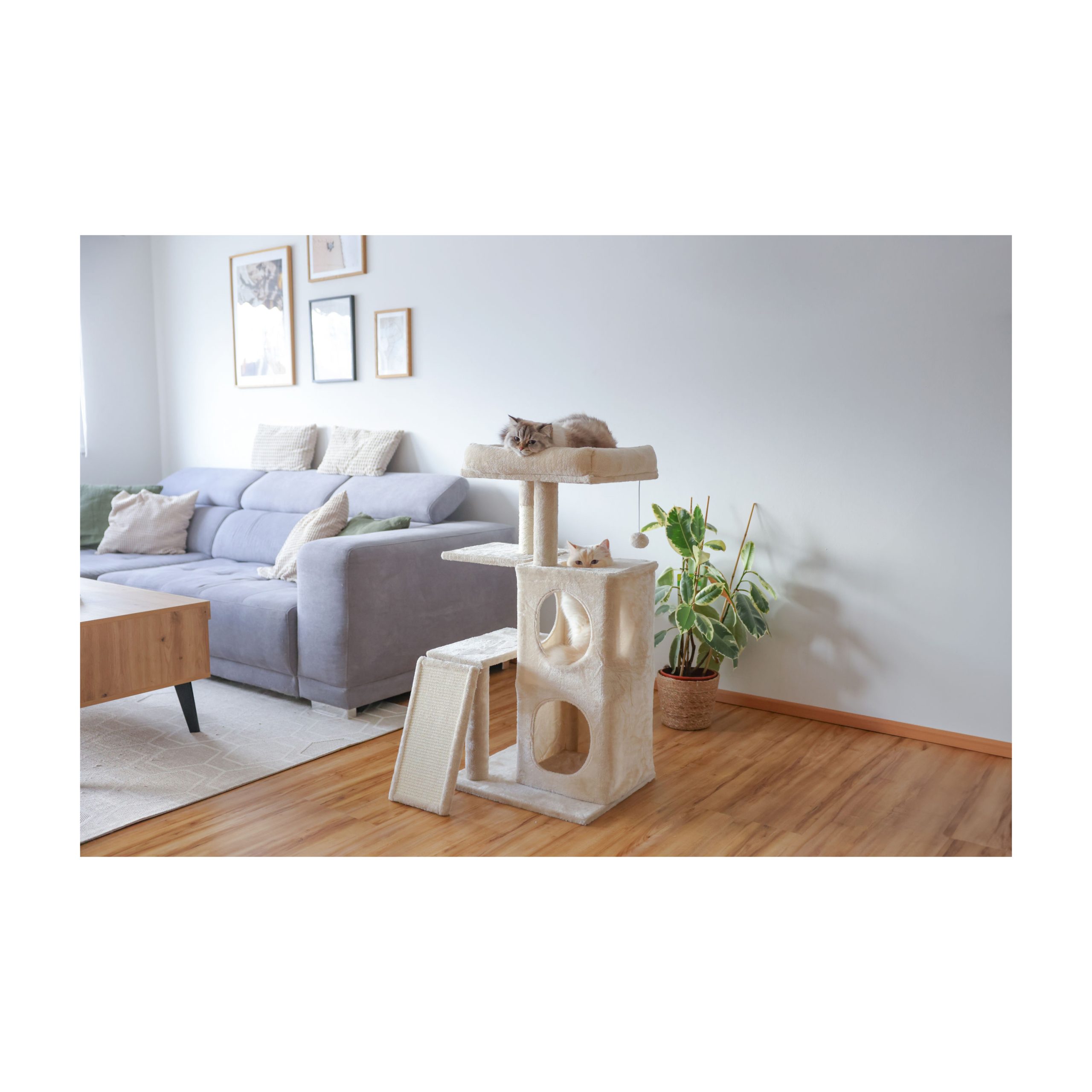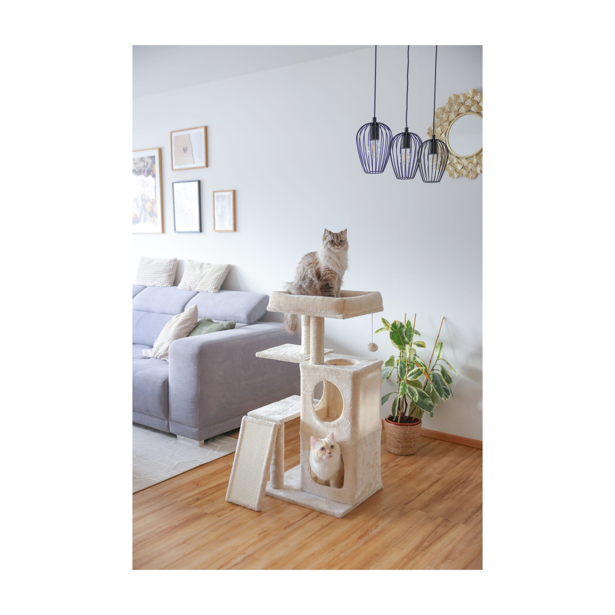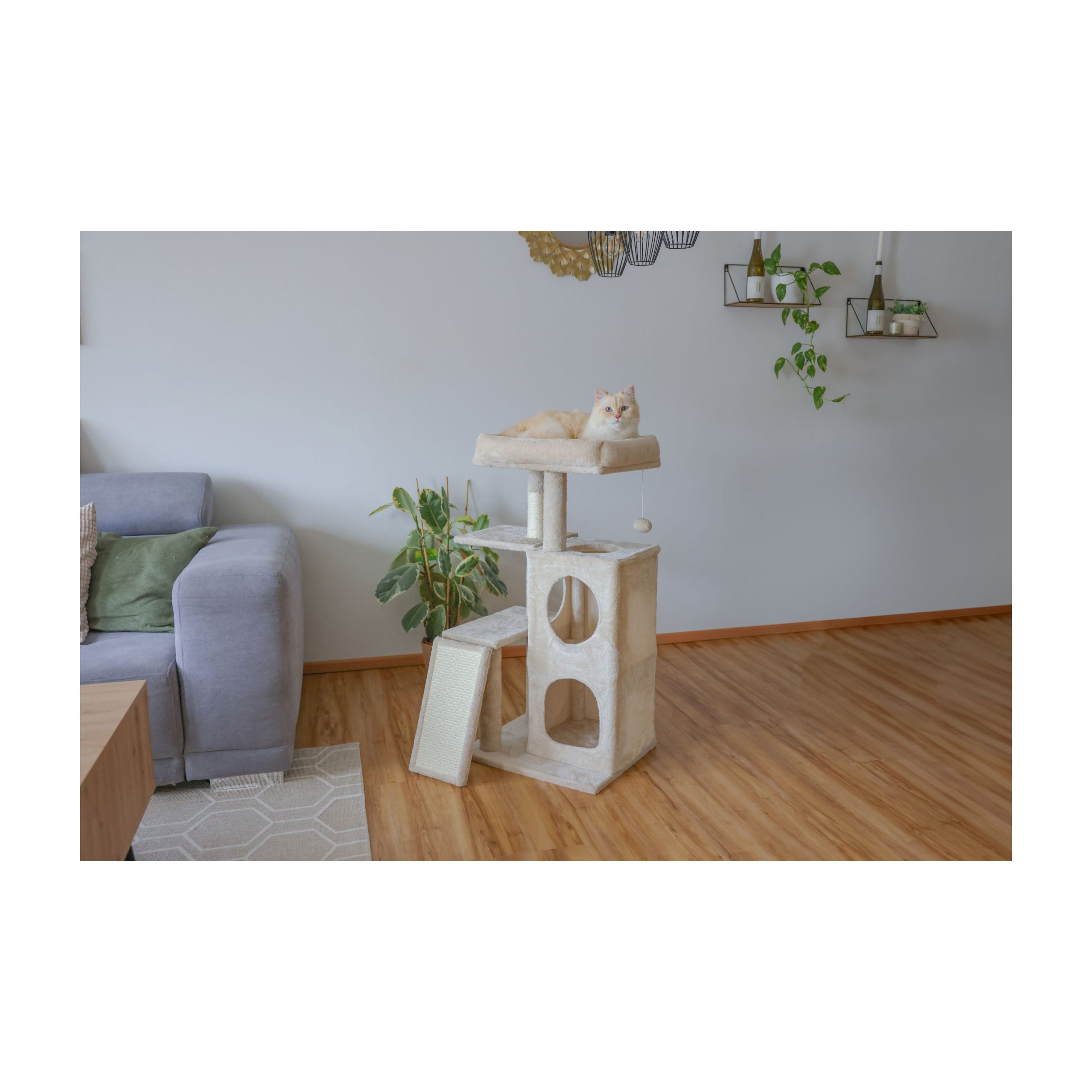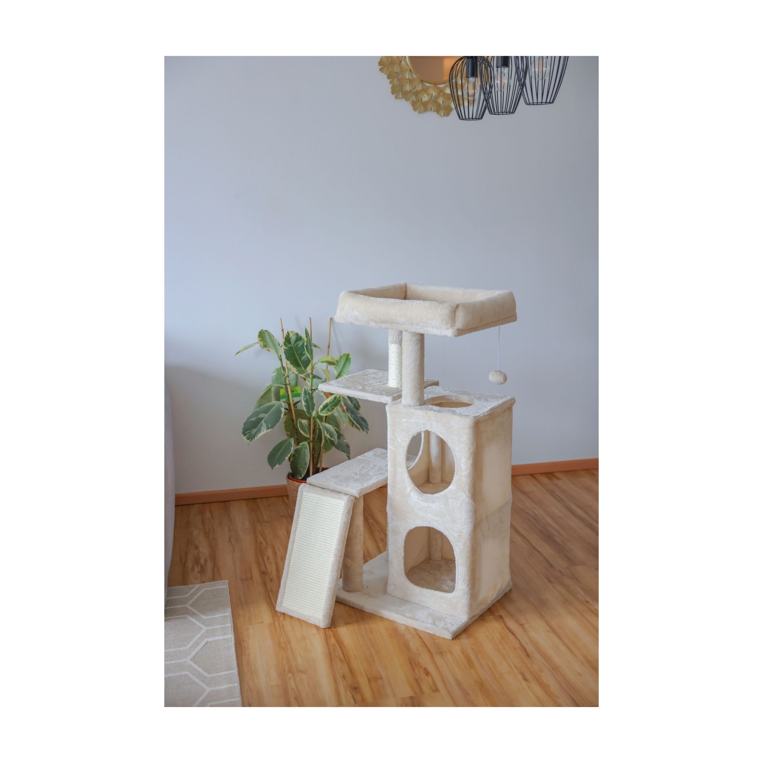 Træet inkluderer også en rampe¨dækket med sisal, som giver mulighed for klatring og pleje af kløerne, samt en integreret plysbold på en elastisk strop, der sikrer timevis af underholdning. Et alsidigt og komfortabelt kradsetræ, der dækker alle din kats behov!
