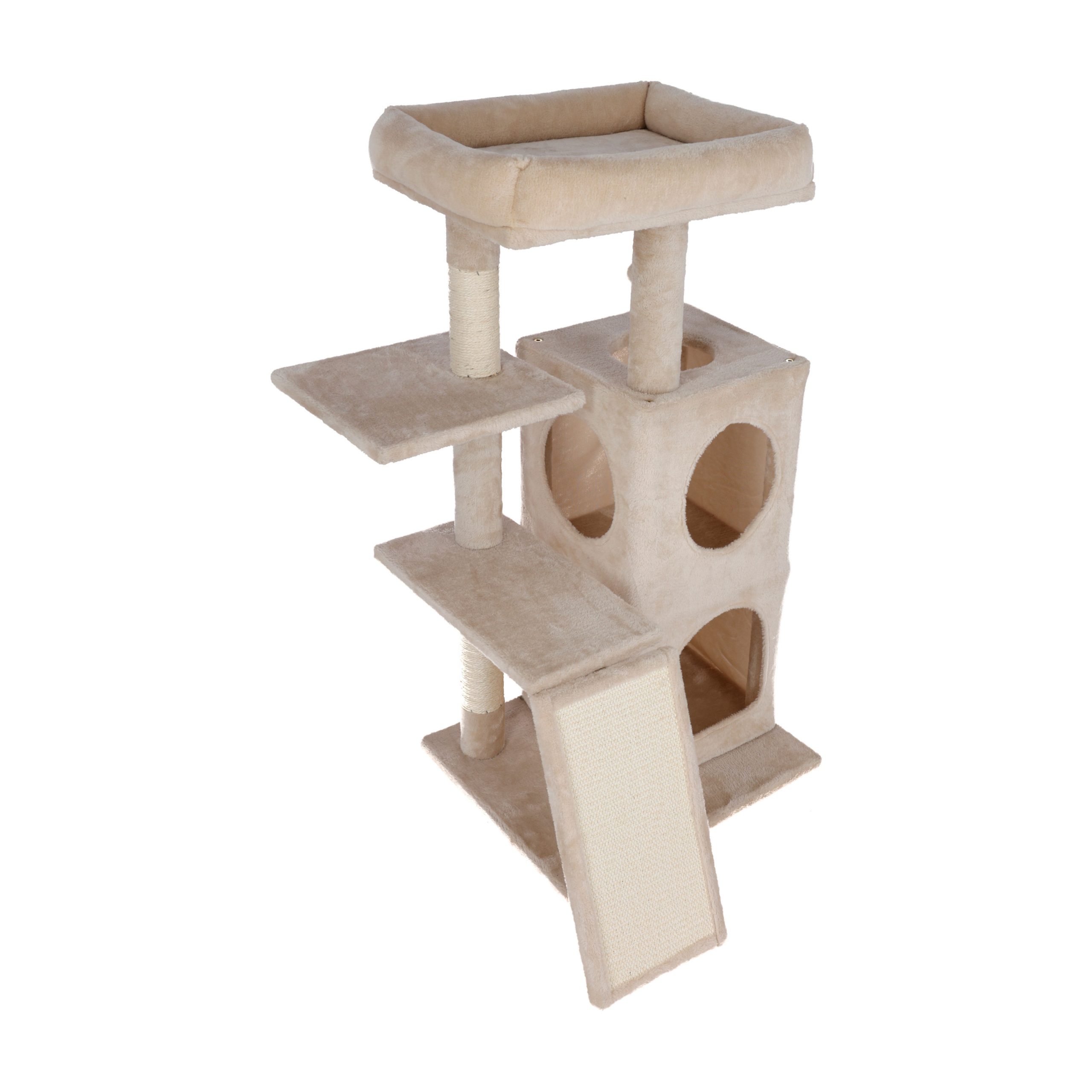 Dette mellemstore kradsetræ byder på flere bløde og hyggelige liggepladser, herunder en rummelig seng med aftagelige puder for ekstra komfort. De to huler i flere niveauer har flere indgange og udgange, hvilket gør dem ideelle som gemmesteder eller afslapningsområder for din kat.