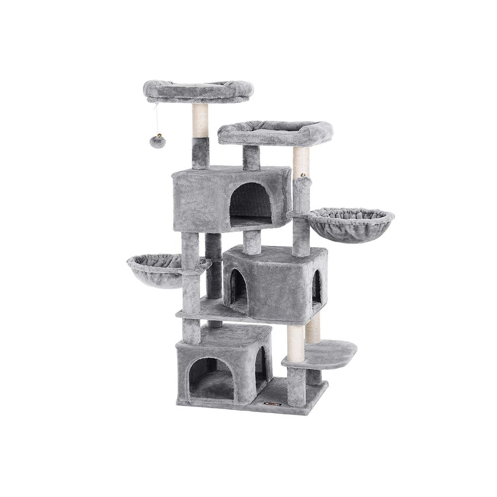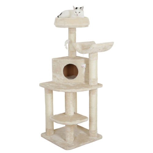 Vores hjørnekattetræ med hule er mere end bare en legeplads – det er en funktionel indretning. Den indbyggede hule giver din kat et sikkert sted at trække sig tilbage og hvile, mens de sisalbeklædte overflader opfylder deres naturlige behov for kløepleje og klatring.