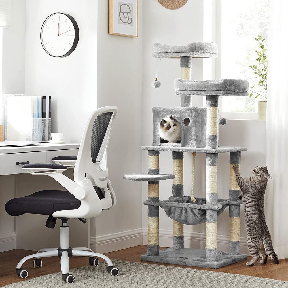 Kattetræet er designet med flere platforme, så din kat kan klatre og udforske på forskellige niveauer. Det er udstyret med flere kradsestolper, så din kat kan kradse og strække sine klør, hvilket er vigtigt for dens sundhed og velvære.