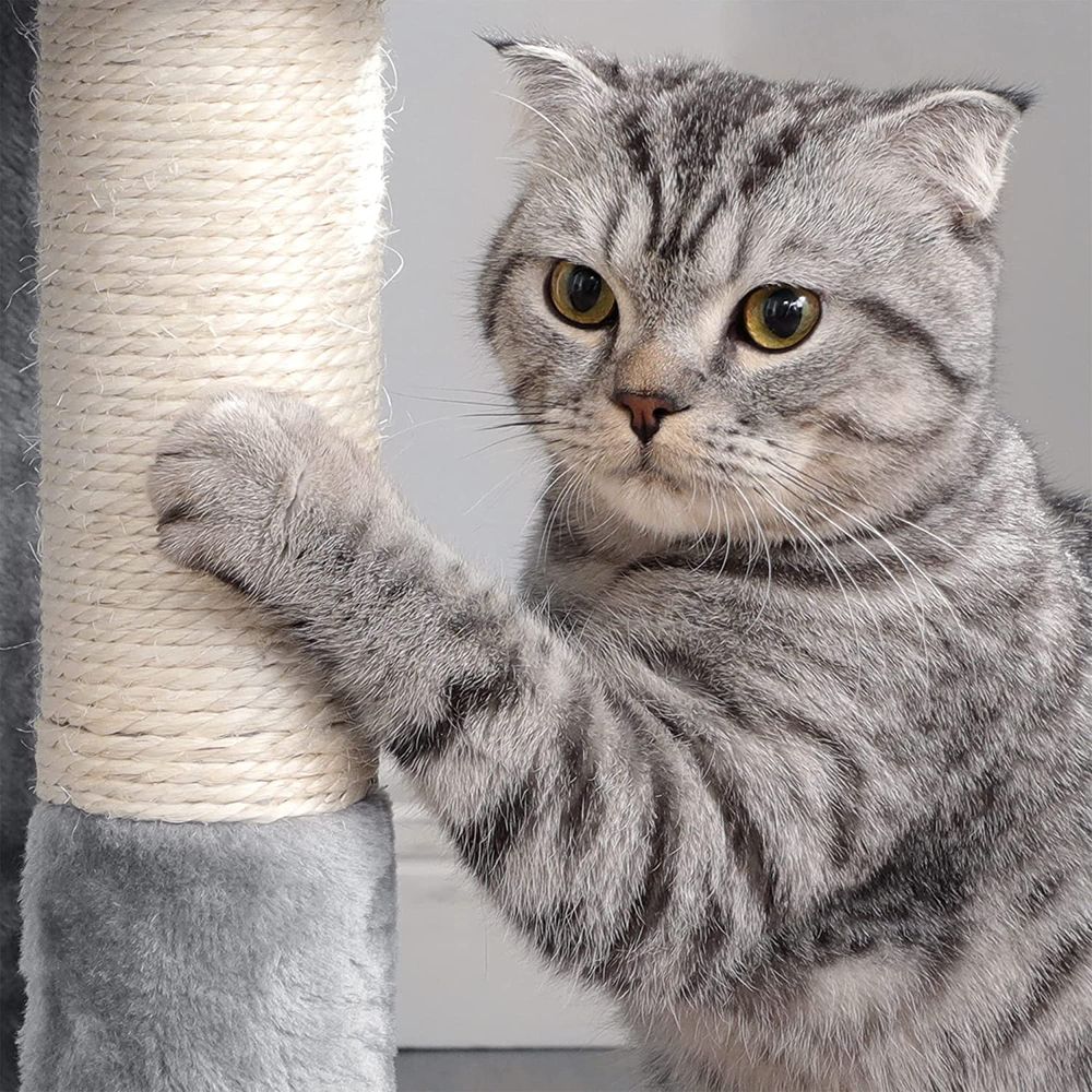 Kradsetræet er dækket med bløde materialer, som giver din kat en behagelig oplevelse, mens den leger og klatrer. Det er også udstyret med en hule, hvor din kat kan trække sig tilbage og føle sig tryg.